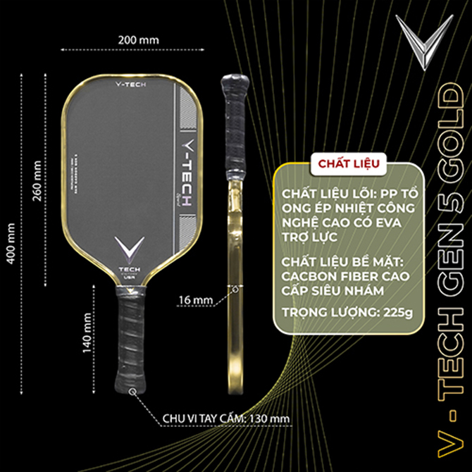VIN TECH Gen 5 Gold Edge Carbon là thế hệ vợt được phát triển dành cho người chơi đặt hiệu suất – độ ổn định – đẳng cấp lên hàng đầu. Không chỉ là một bản nâng cấp, Gen 5 là tuyên ngôn công nghệ mới của VIN TECH: đánh chắc, kiểm soát sâu và bền bỉ theo thời gian.