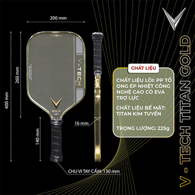 VIN TECH Gen 5 Gold Edge Titanium là thế hệ vợt được phát triển cho người chơi đòi hỏi độ ổn định cao, lực đánh rõ ràng và cảm giác tay chắc chắn. Sự kết hợp giữa viền Gold gia cường và bề mặt Titan tạo nên một cây vợt cân bằng giữa sức mạnh và kiểm soát, phù hợp cho lối chơi hiện đại và bền bỉ.