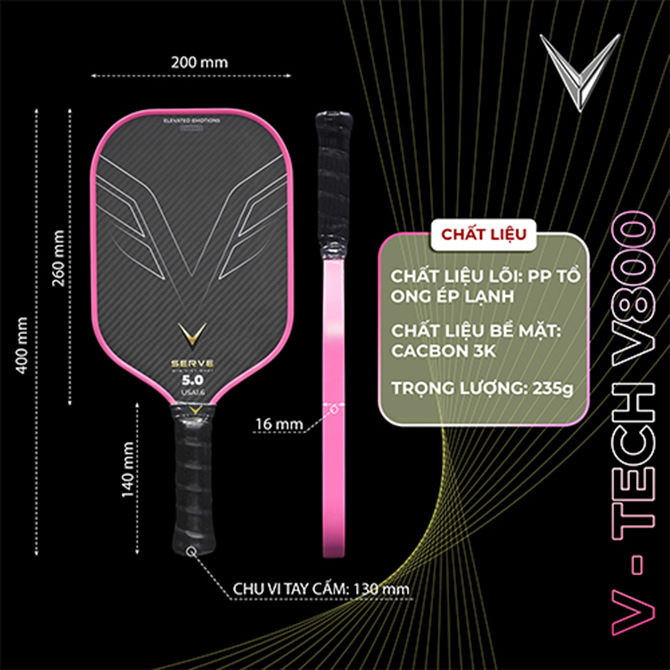 VIN TECH V800 là dòng vợt được phát triển theo định hướng dễ tiếp cận – dễ làm quen – hiệu suất ổn định, phù hợp với người chơi pickleball từ mới bắt đầu đến phong trào nâng cao. V800 không phô trương công nghệ, mà tập trung vào trải nghiệm đánh thật: chắc tay, kiểm soát tốt và đánh lâu không mệt.