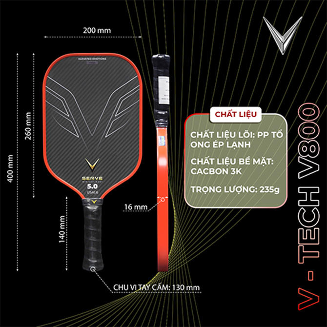 VIN TECH V800 là dòng vợt được phát triển theo định hướng dễ tiếp cận – dễ làm quen – hiệu suất ổn định, phù hợp với người chơi pickleball từ mới bắt đầu đến phong trào nâng cao. V800 không phô trương công nghệ, mà tập trung vào trải nghiệm đánh thật: chắc tay, kiểm soát tốt và đánh lâu không mệt.